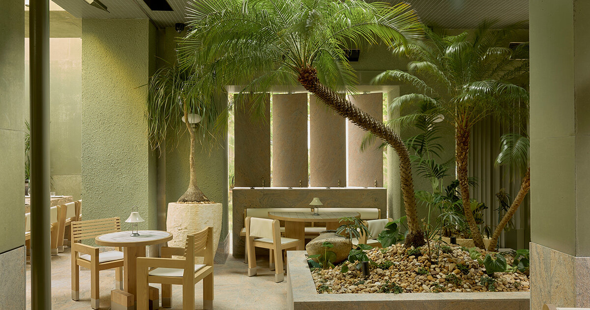 "Golden Avenue occupies a low-rise, heritage-protected pocket of Brisbane, adjacent to historic buildings and surrounded by high-rise towers beyond. The team at J.AR OFFICE approached the site with a deliberate sensitivity to scale, choosing a human-level form to engage directly with the street. The design emphasizes the Australian city's subtropical climate as an integral part of the hospitality experience. The structure itself draws from brutalist sensibilities, using green-tinted off-form concrete, pink Juparana stone, and dense plantings to form a layered and textured palette."