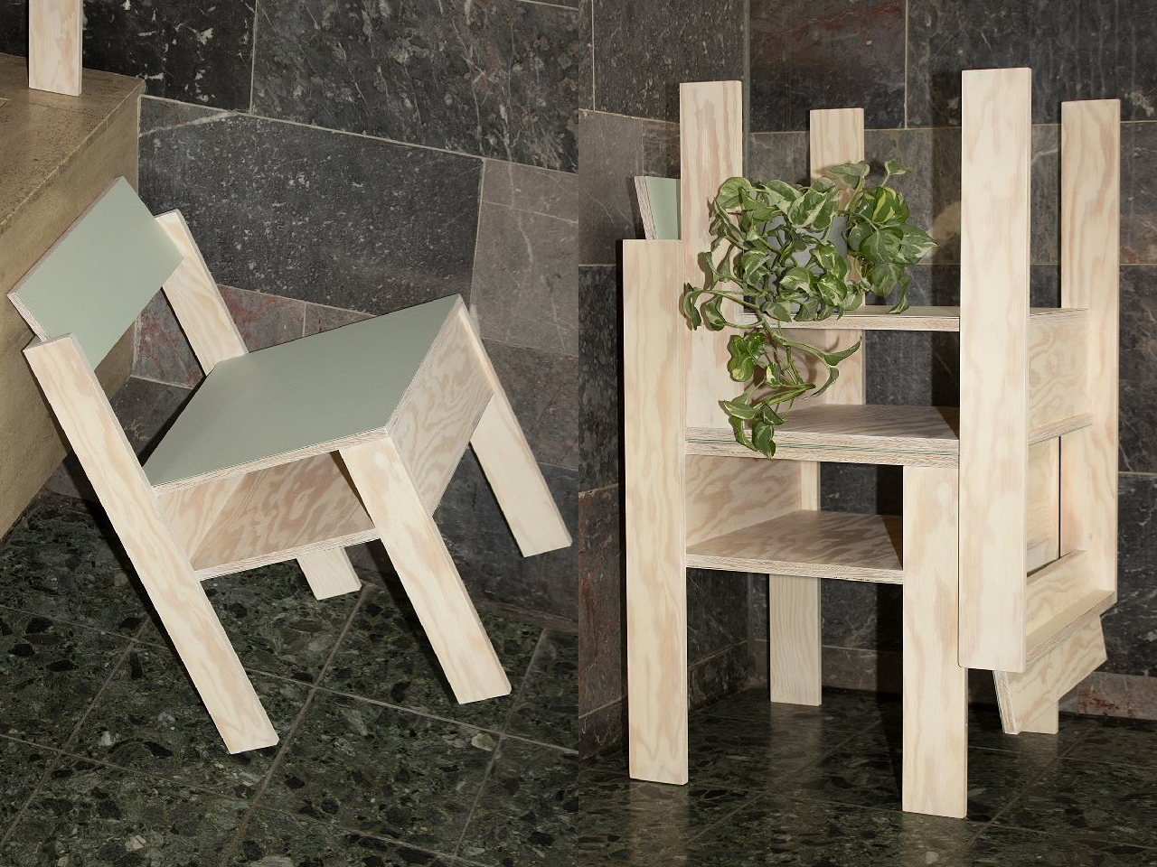 The Same Same twin chairs are minimalist wooden seats combining pale plywood construction, clean geometric lines, and a subtle sage green accent on seat and storage surfaces. Each chair functions independently as comfortable seating while offering under-seat storage sized for magazines, small objects, or standard euro containers. Paired chairs enable modular configurations—upside-down stacking for multi-level shelving, side-by-side nesting for bench seating, or arrangements as display units, side tables, plant stands, or storage towers. The design encourages experimentation and playful interaction and draws inspiration from human relationships where partnership unlocks enhanced possibilities without negating individual completeness. The combination of practical storage, restrained Scandinavian aesthetics, and configurability suits small apartments and studio living.