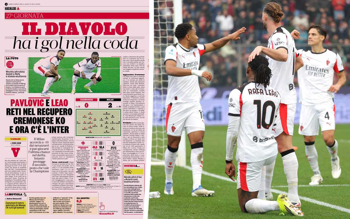 Milan must have feared yet more dropped points against a side battling relegation when the scoreboard read 0-0 on 89 minutes. Then, Strahinja Pavlovic netted from a corner and Rafael Leao converted a counter-attack, so the Rossoneri ended up winning 2-0.