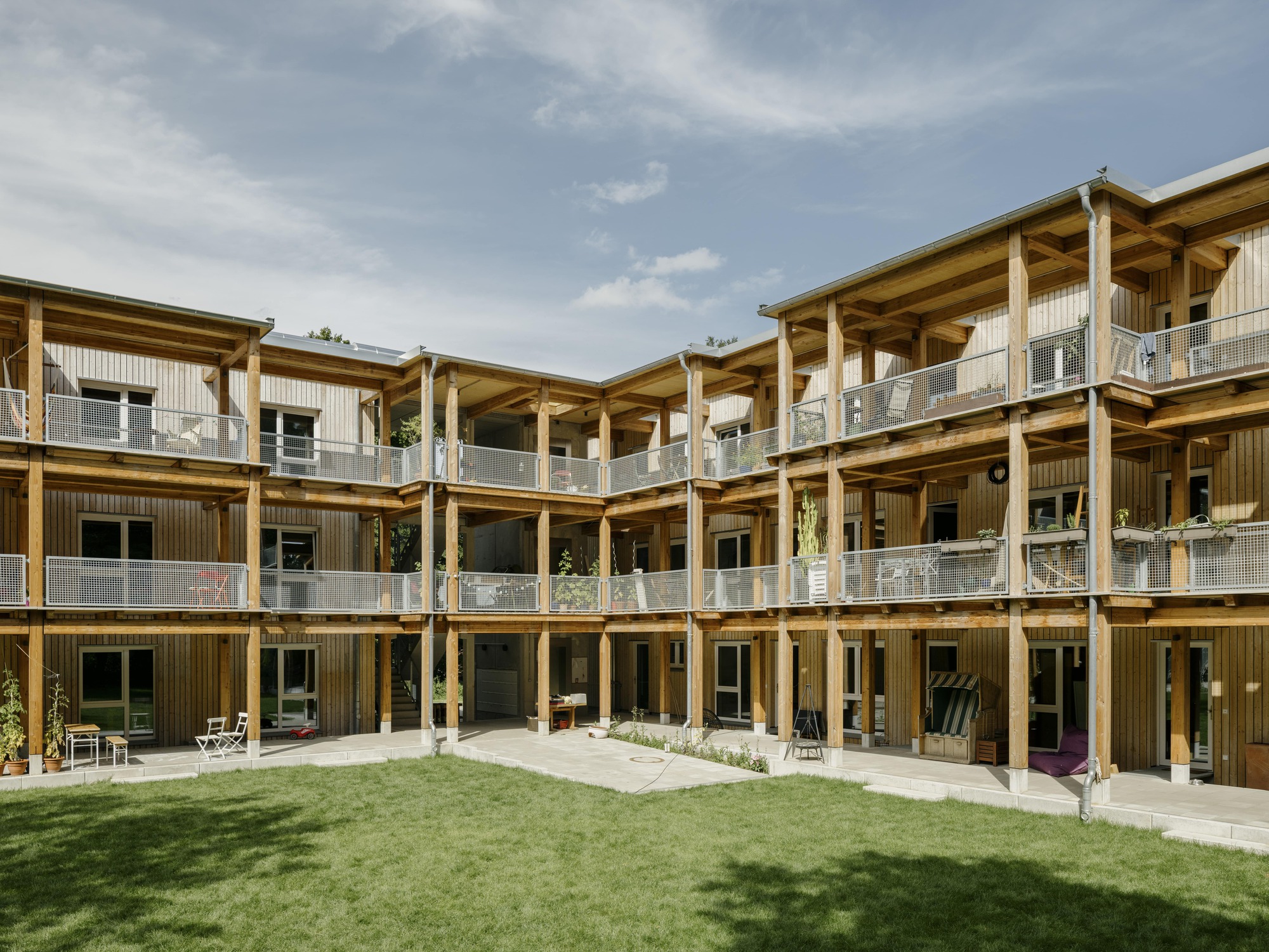 The Christinger Residence provides about fifteen rental apartments for seniors on a donated 1,933 m² site, converting a 1940s villa to support reduced autonomy.