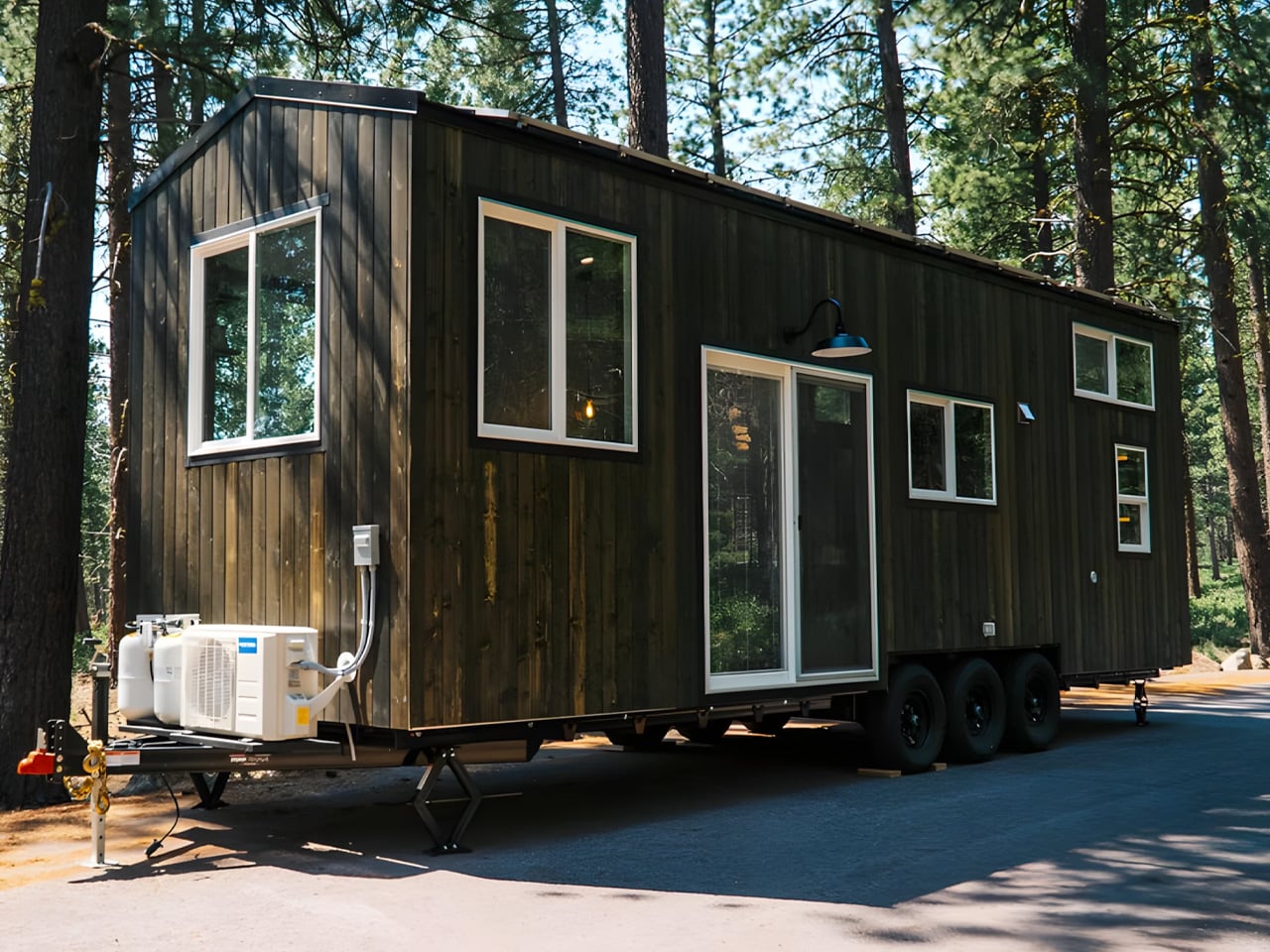 Spindrift's 30-foot Olympic tiny house makes 255 square feet feel genuinely livable through abundant glazing, strategic storage, and a functional, flexible layout. Large windows and plentiful glass visually expand the interior while a raised living area creates substantial storage beneath. Three bench seats open for storage and built-in Bluetooth and climate systems maintain comfort. The kitchen includes a three-burner gas cooktop, full oven, proper fridge-freezer, farmhouse sink, and washer-dryer hookups; a flip-up countertop provides dining space. The bathroom contains a vanity, full shower, and composting toilet. The upstairs bedroom features low ceilings, a skylight, and a double bed, and the staircase doubles as storage. Each Olympic can be built to buyer specifications for customization.